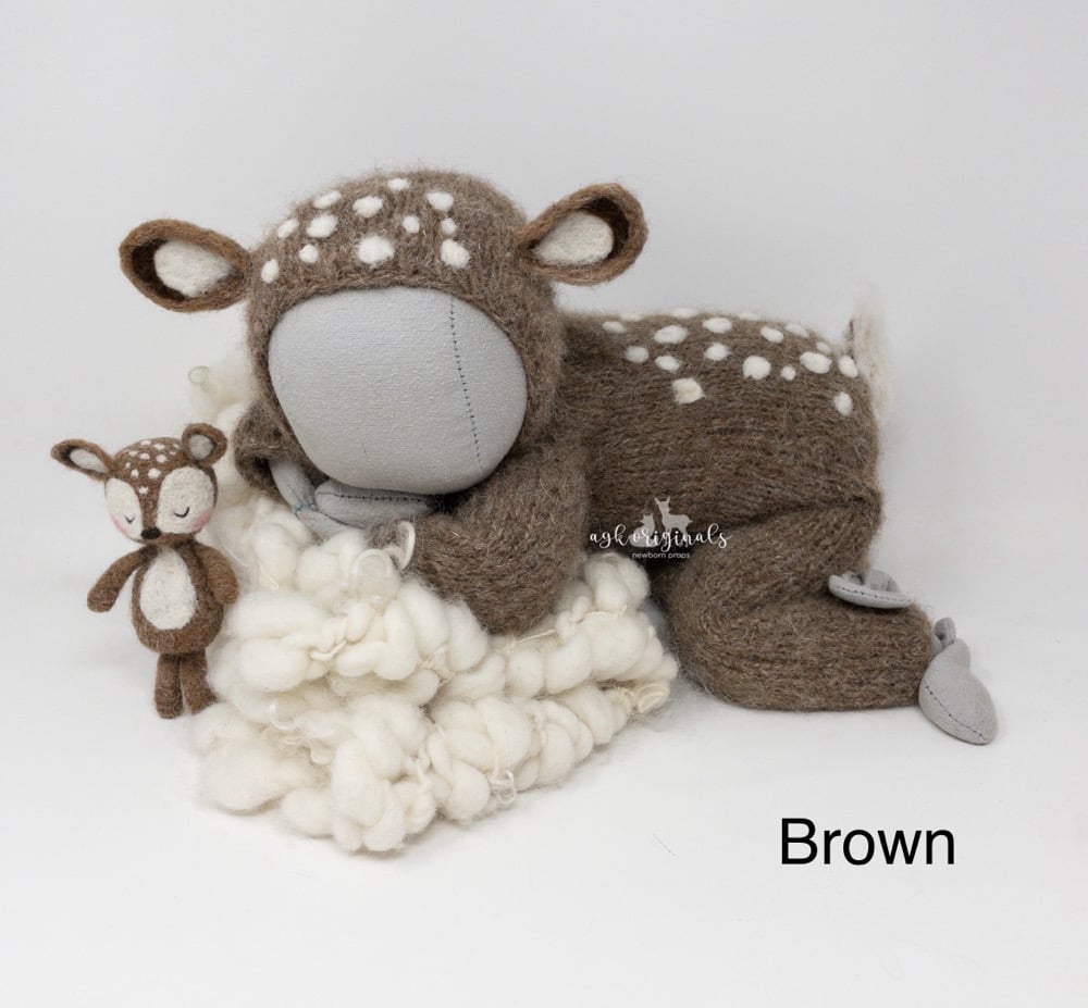This cozy newborn-sized footless fawn sleeper is hand-knit with love using a soft, luxurious blend of superfine alpaca and merino wool. with adorable spots and fawn tail. Designed for comfort and style, it’s the perfect for those woodland themed newborn shoots.