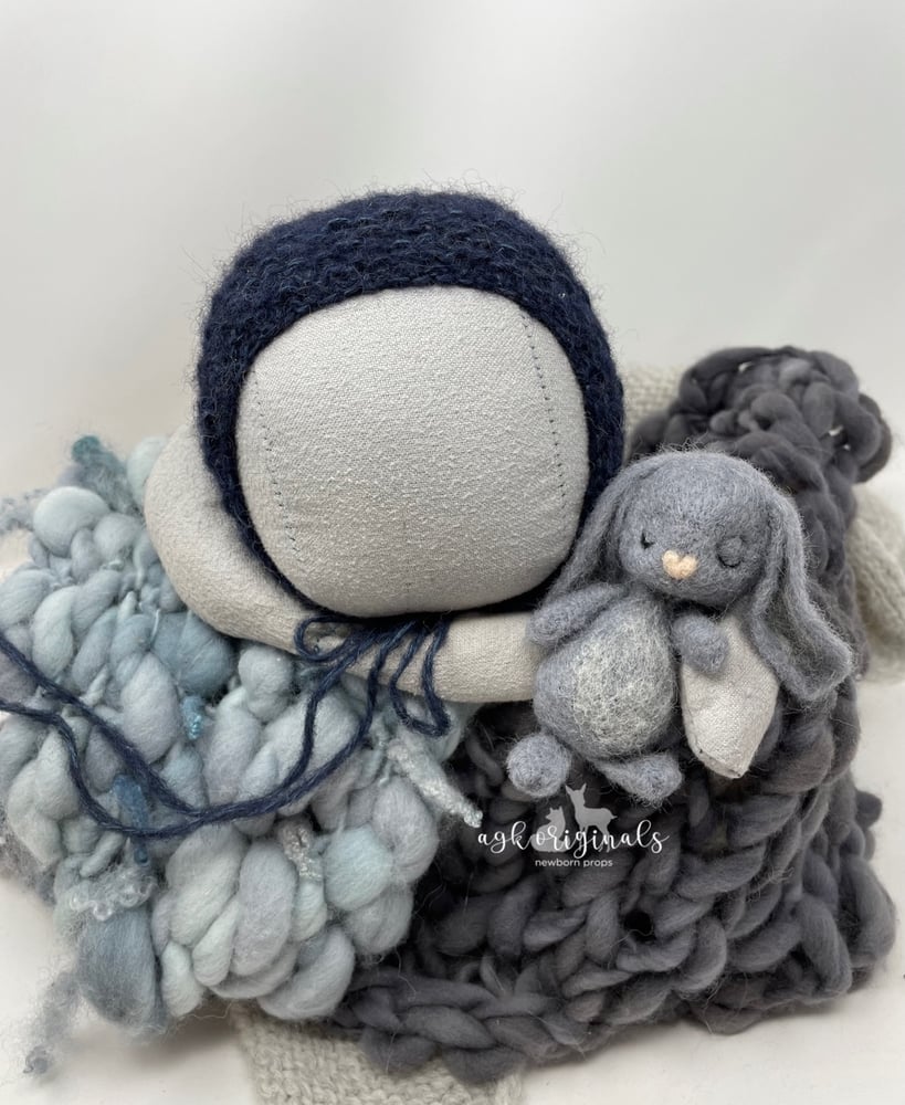 TNT layer 21x14 (made from hand dyed and hand spun merino yarn) Tiny accent lux curly layer 9x5 Navy newborn sized bonnet (made from merino yarn) Handfelted bunny lovey (made from quality wool)